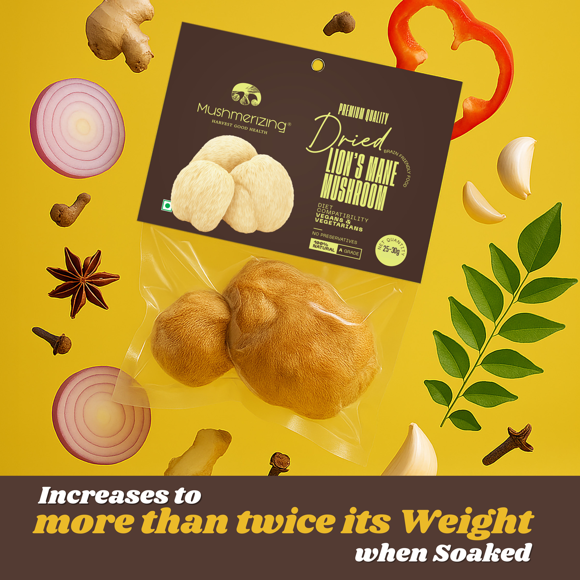 Functional Goodness: Traditionally valued for supporting brain and nerve health. Lion’s Mane is often associated with general cognitive wellness, mental clarity, and day-to-day focus. It is also appreciated for helping ease everyday stress and for its natural neuro-nutrient profile. In addition, Lion’s Mane provides dietary fibre, plant-based protein, and essential minerals like potassium and iron. It is naturally low in fat, cholesterol-free, and nutrient-dense. Along with these nutritional qualities, it also offers a natural source of Vitamin D and contains inherent antioxidant and anti-inflammatory properties — making it a wholesome addition to a balanced diet.